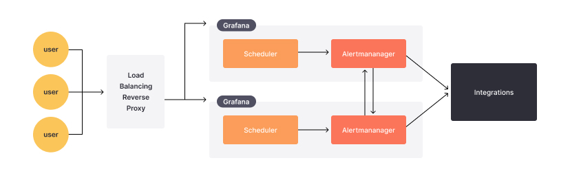 When running Grafana Alerting in high availability, the operational mode of the scheduler remains unaffected, and each Grafana instance evaluates all alerts. The operational change happens in the Alertmanager when it deduplicates alert notifications across Grafana instances.