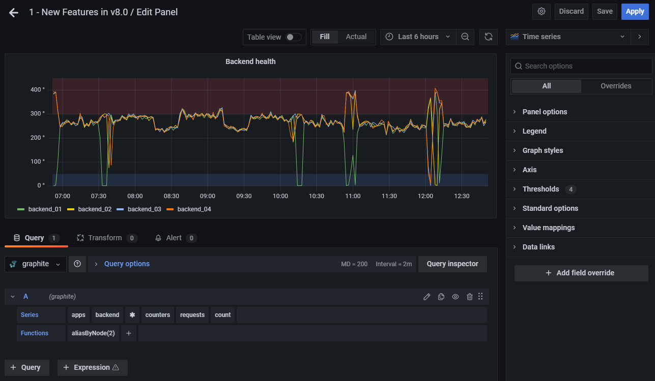 - Apply: Applies changes you made and closes the panel editor, returning you to the dashboard. You will have to save the dashboard to persist the applied changes.