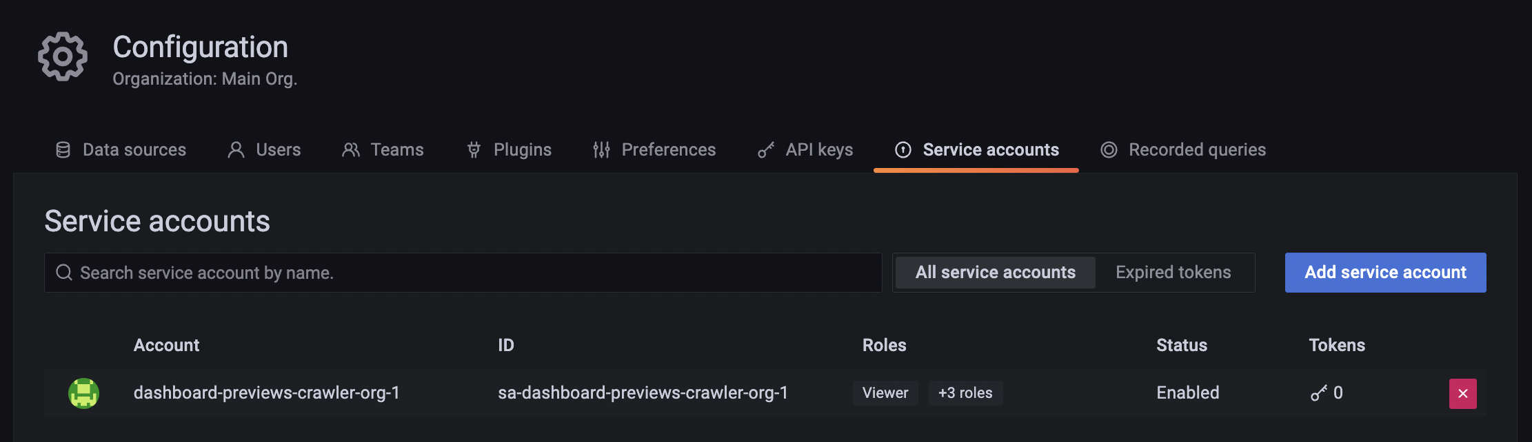 Service accounts are created per organization. They are visible in the service account configuration tab, and use the following naming convention: dashboard-previews-crawler-{organization_id}.