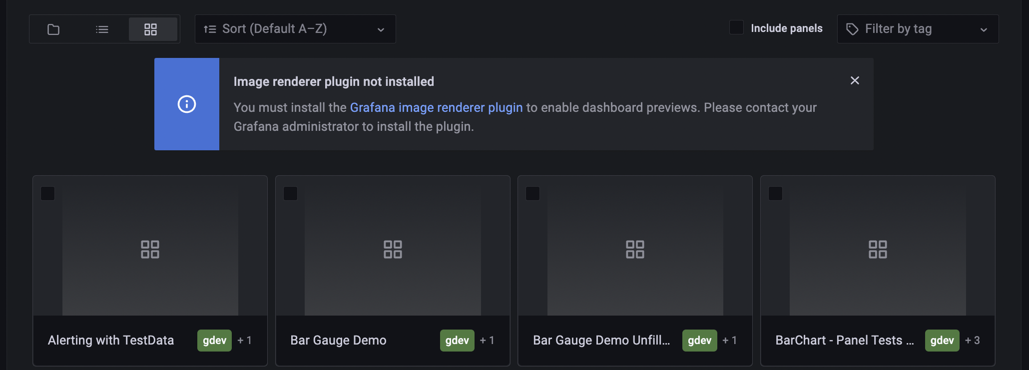 If the dashboard preview placeholders do not appear or if you see any warning messages, check Grafana server logs for more context. The logger used by the Previews Service is named previews_service.