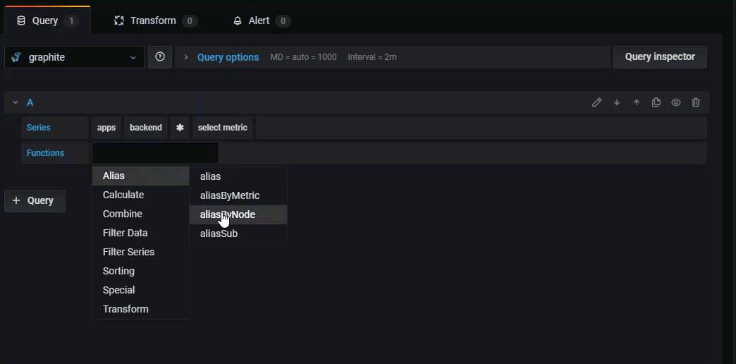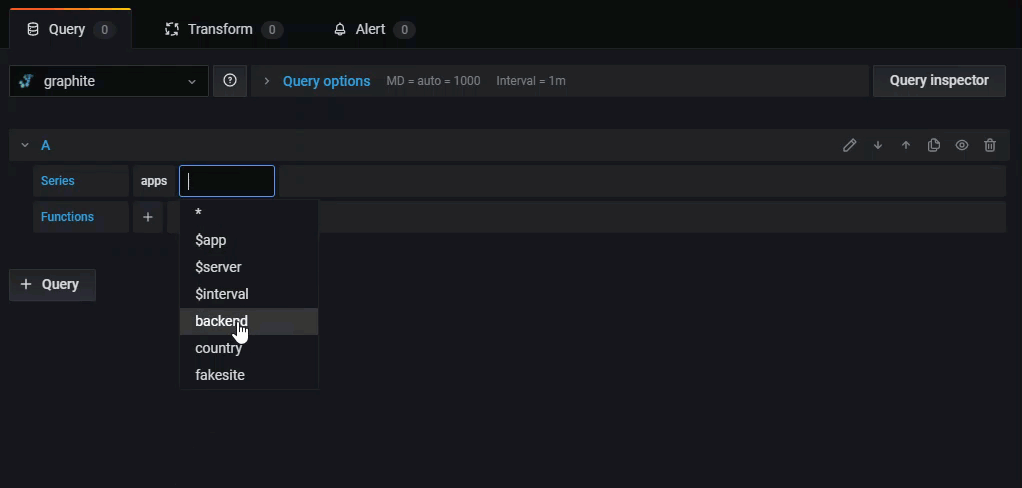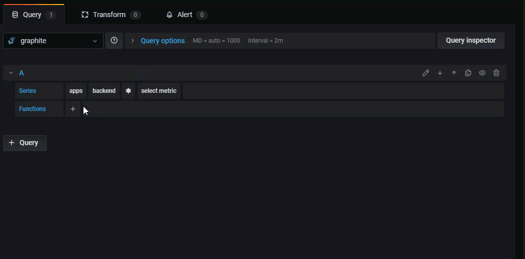 Grafana has an advanced Graphite query editor that lets you quickly navigate the metric space, add functions, change function parameters and much more. The editor can handle all types of graphite queries. It can even handle complex nested queries through the use of query references.