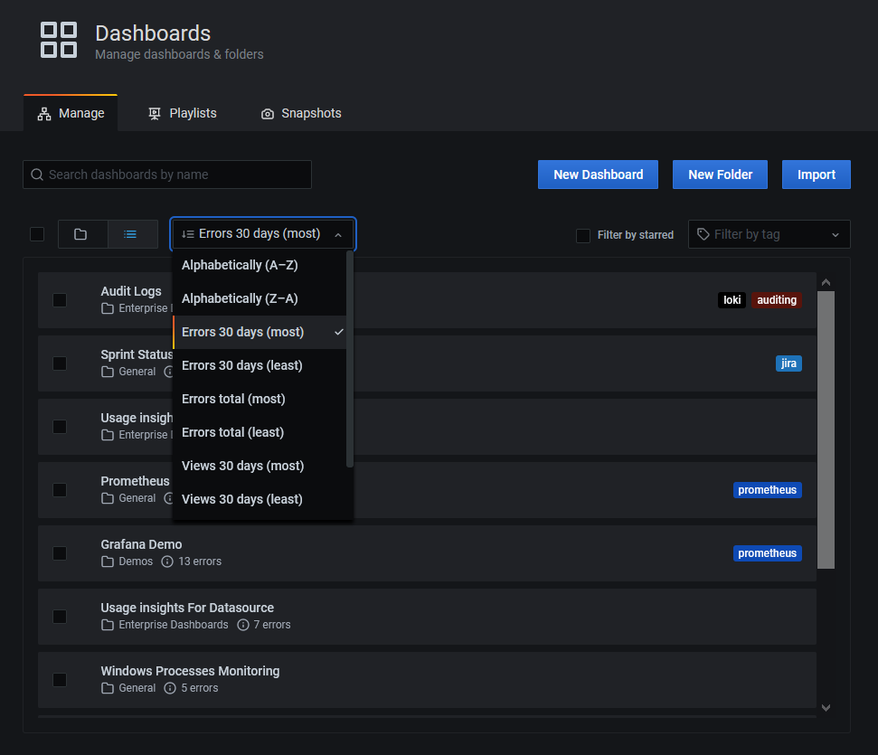 In the search view, you can sort dashboards by using insights data. Doing so helps you find unused or broken dashboards or discover those that are most viewed.