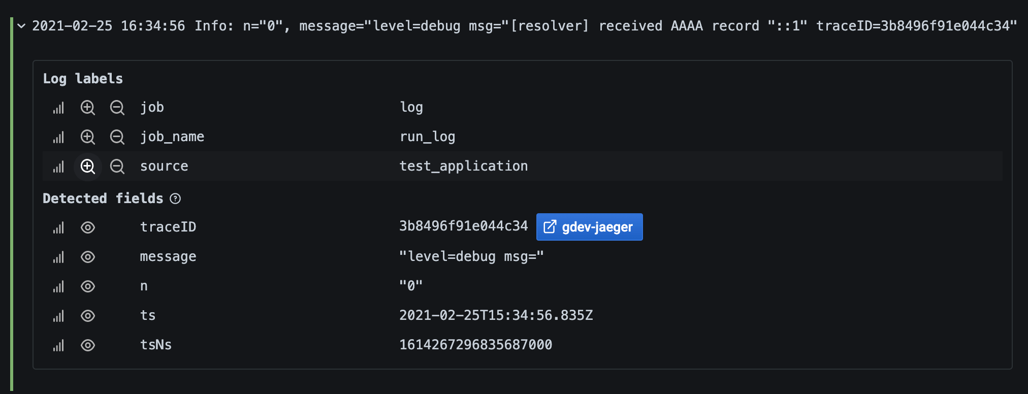 Each log row has an extendable area with its labels and detected fields, for more robust interaction. For all labels we have added the ability to filter for (positive filter) and filter out (negative filter) selected labels. Each field or label also has a stats icon to display ad-hoc statistics in relation to all displayed logs.