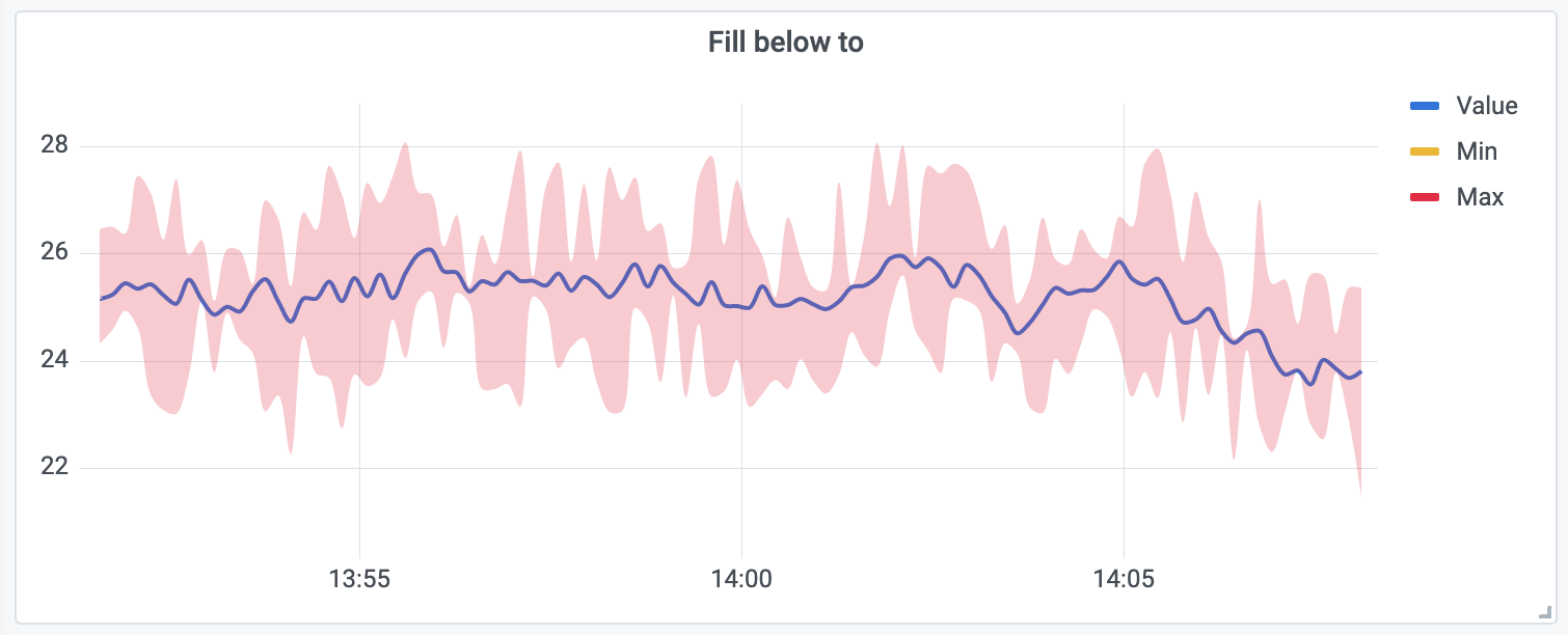 The following example shows three series: Min, Max, and Value. The Min and Max series have Line width set to 0. Max has a Fill below to override set to Min, which fills the area between Max and Min with the Max line color.