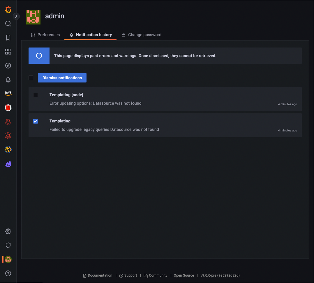 In order to support debugging issues in Grafana, error alerts that appear in Grafana include a trace ID, and these alerts can be accessed under your Profile. This is currently an opt-in feature that can be accessed by enabling two feature flags: