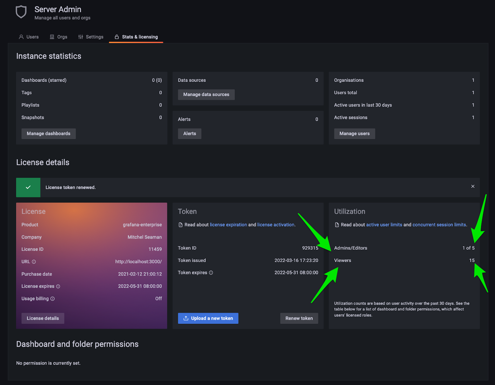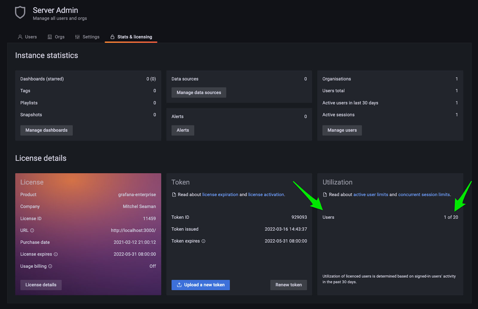 For example, if you have a license for 10 active admins and 100 active viewers in your Grafana Enterprise license, then starting in v9.0 you will have a limit of 110 active users, and it doesn’t matter what roles those users have, they will all be counted and enforced the same.