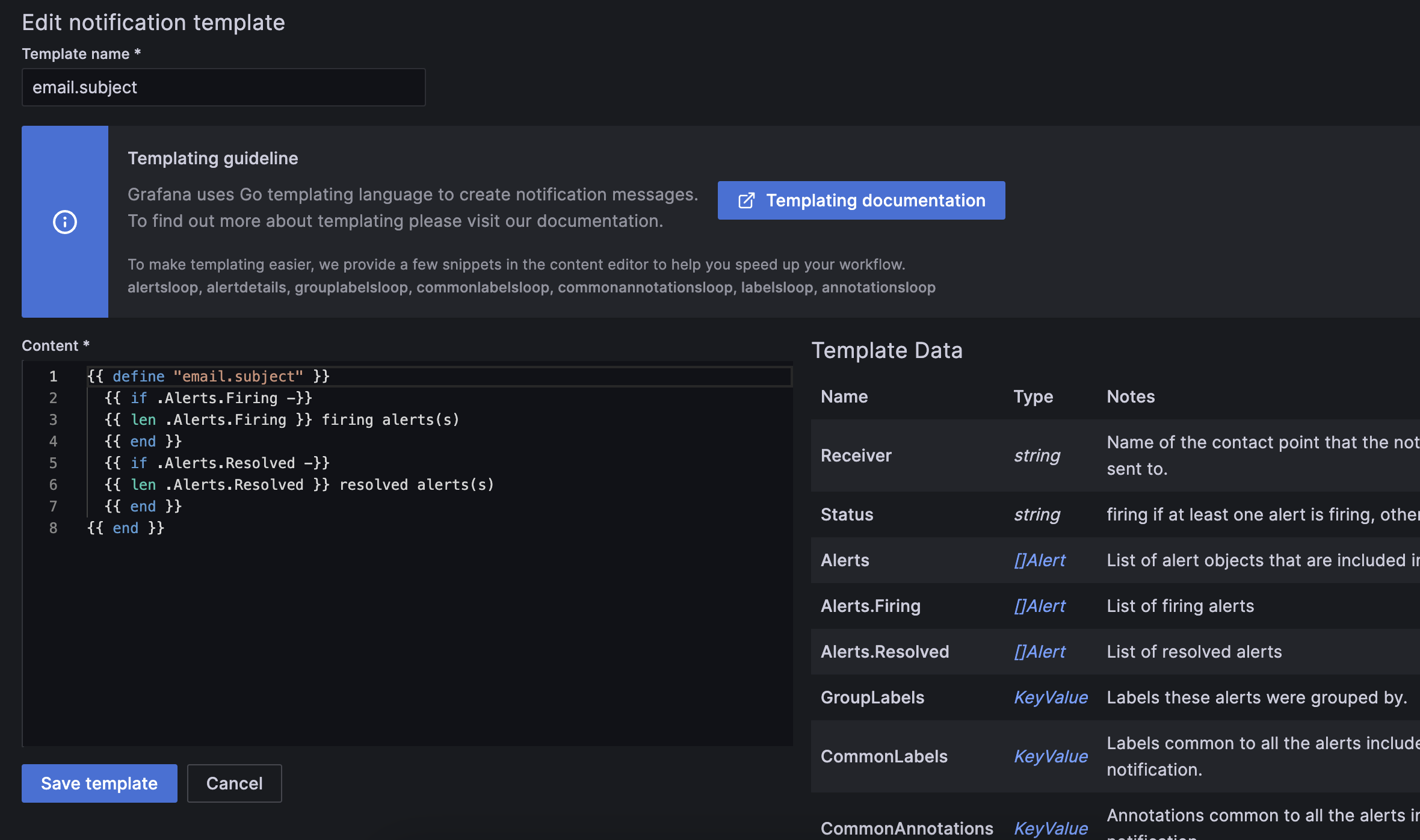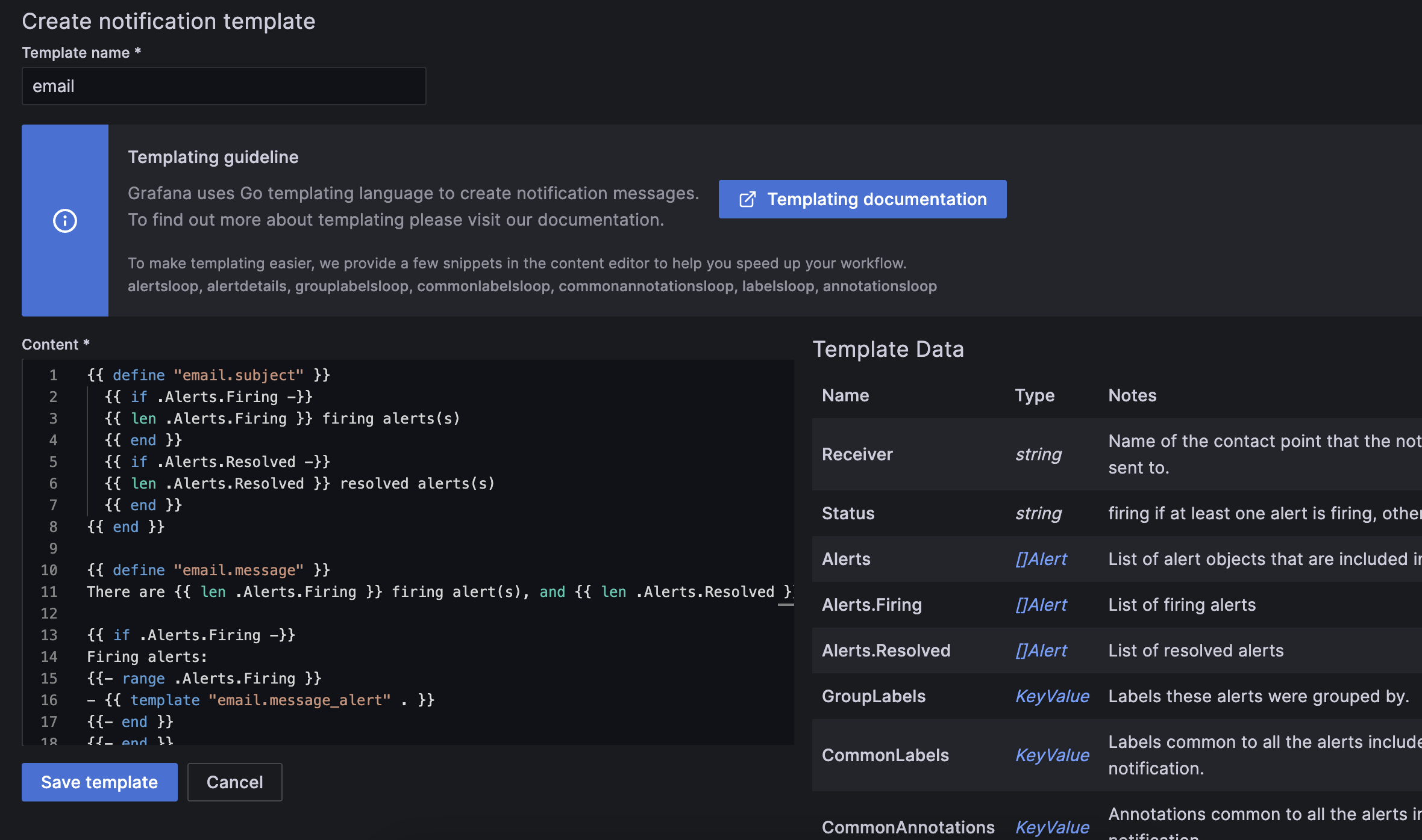 email.message_alerttemplate is used to print the labels and values for each firing and resolved alert while theemail.messagetemplate contains the structure of the email.{{- define "email.message_alert" -}} {{- range .Labels.SortedPairs }}{{ .Name }}={{ .Value }} {{ end }} has value(s) {{- range $k, $v := .Values }} {{ $k }}={{ $v }}{{ end }} {{- end -}} {{ define "email.message" }} There are {{ len .Alerts.Firing }} firing alert(s), and {{ len .Alerts.Resolved }} resolved alert(s) {{ if .Alerts.Firing -}} Firing alerts: {{- range .Alerts.Firing }} - {{ template "email.message_alert" . }} {{- end }} {{- end }} {{ if .Alerts.Resolved -}} Resolved alerts: {{- range .Alerts.Resolved }} - {{ template "email.message_alert" . }} {{- end }} {{- end }} {{ end }}Execute the template from the message field in your contact point integration: