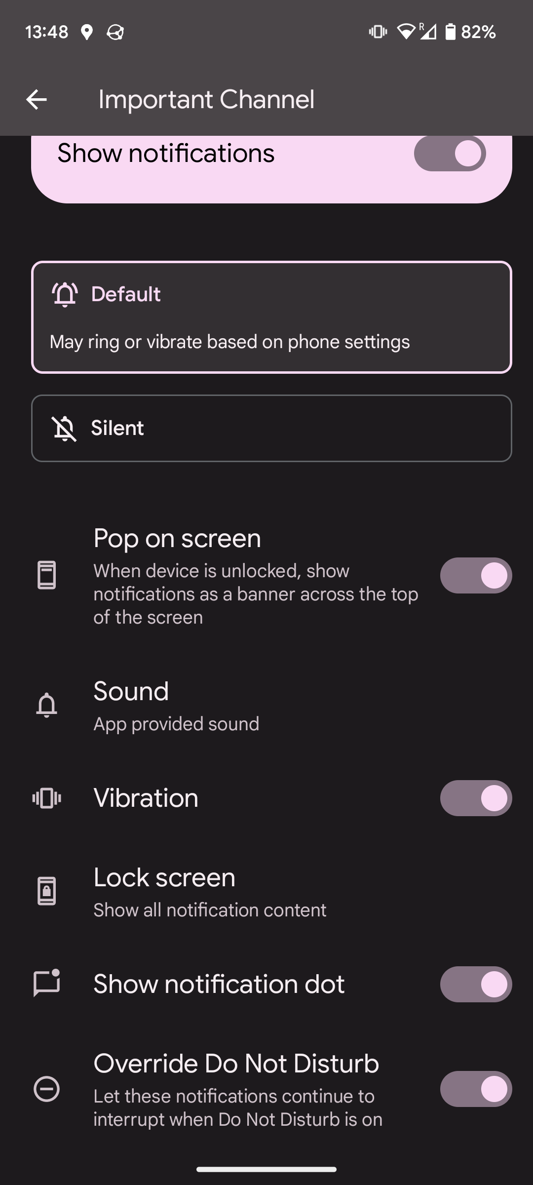 - On most Android versions, the Override Do Not Disturb option is available in the channel options described above.