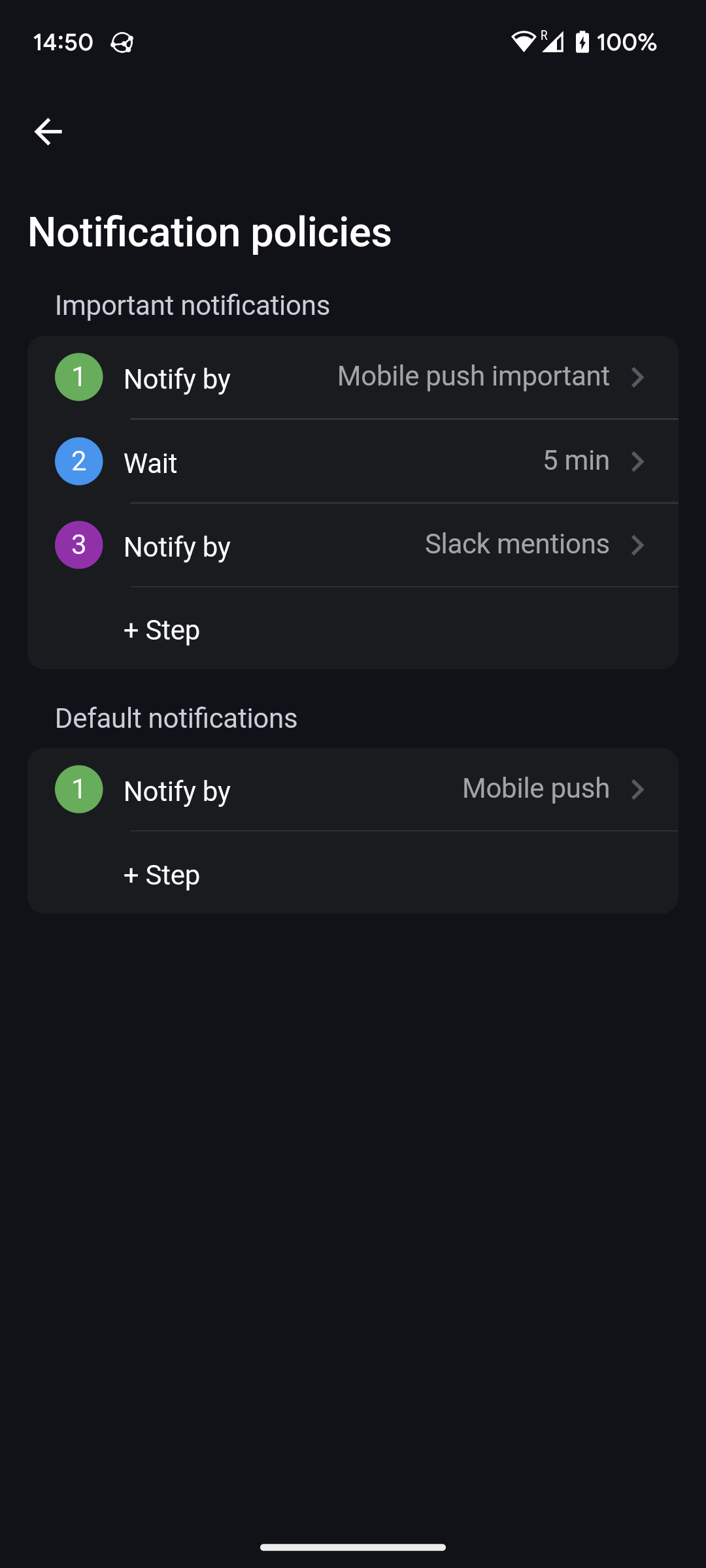 In the Settings tab of the mobile app, tap on Notification policies to review, reorder, remove, add or change steps.