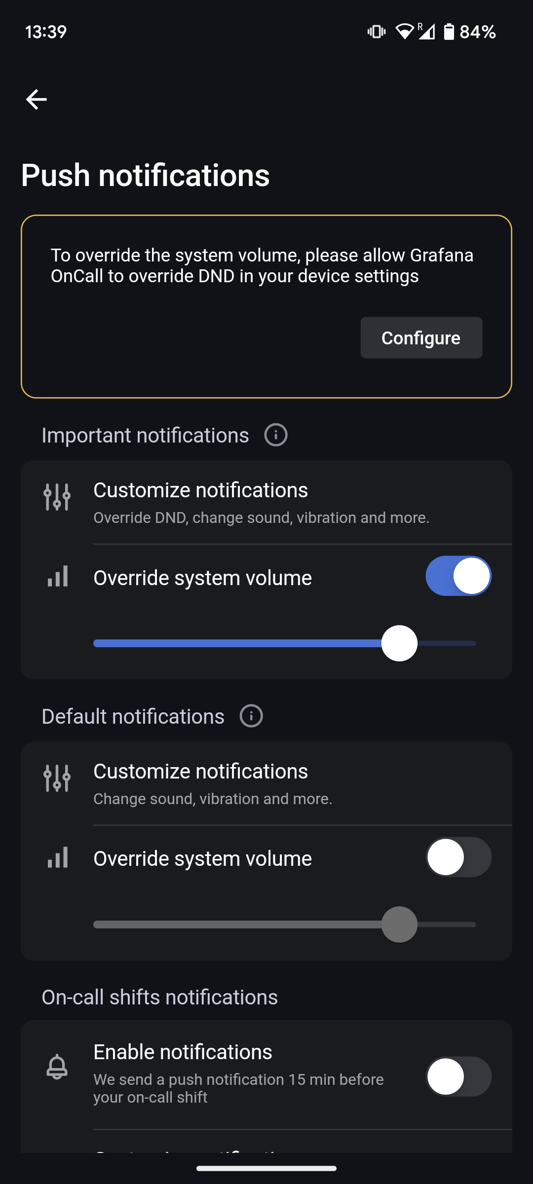 To enable or disable on-call shift notifications, use the On-call shift notifications section in the Push notifications settings.